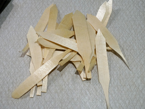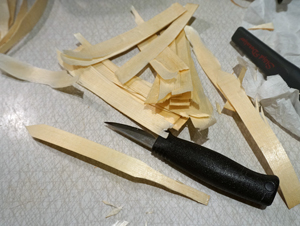 När man täljer blir det en del spån. Särskilt fina blir spånen som man får när man täljer med bandkniv i täljhästen.