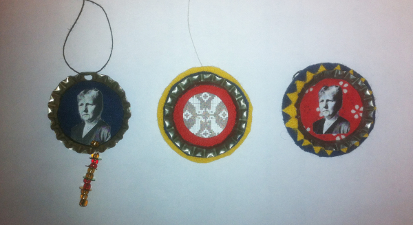 Det behövs: kapsyler, filt, sax, lim, nål, tråd, tång, en bild på Lilli Zickerman, hammare och spik…